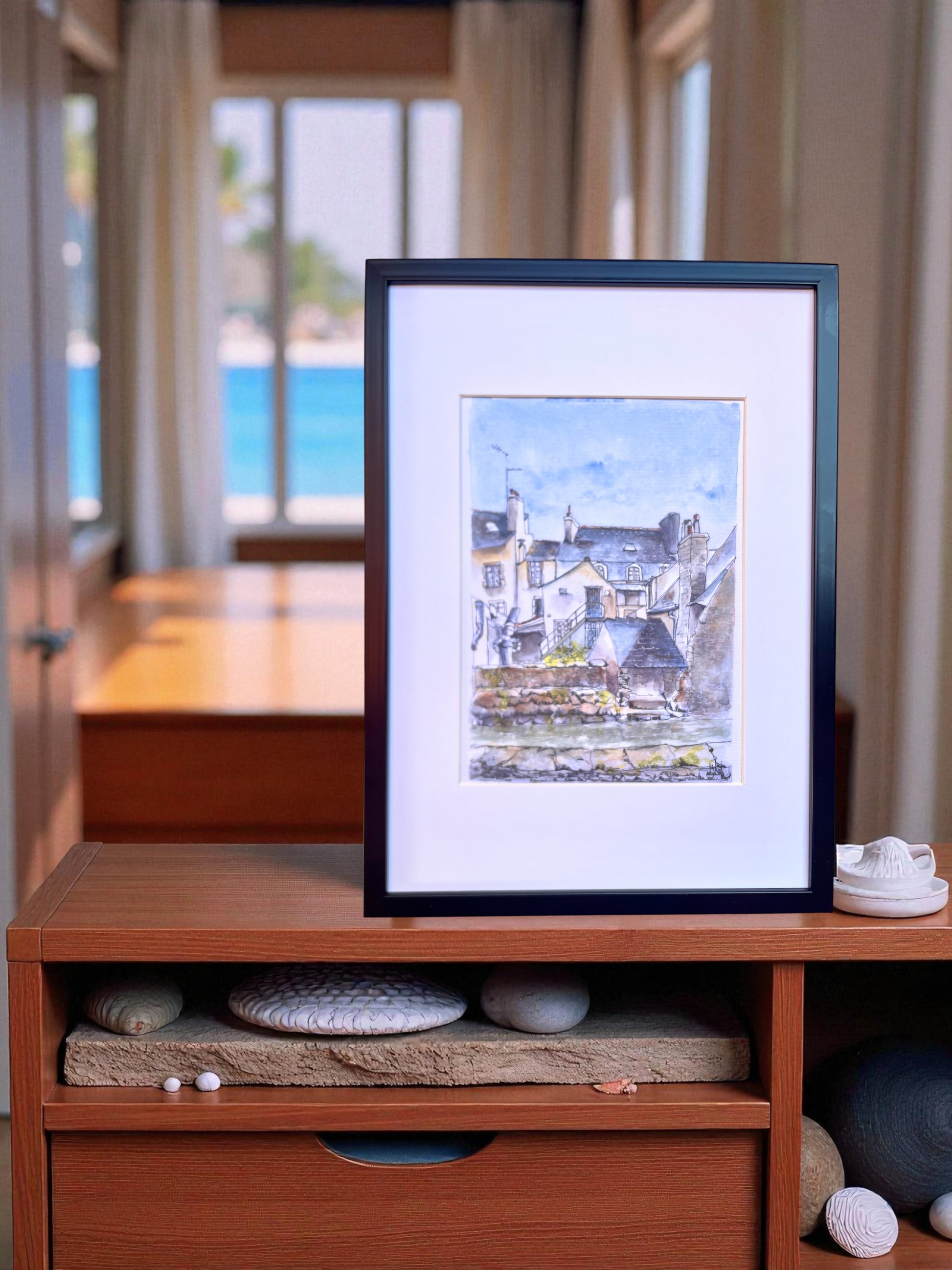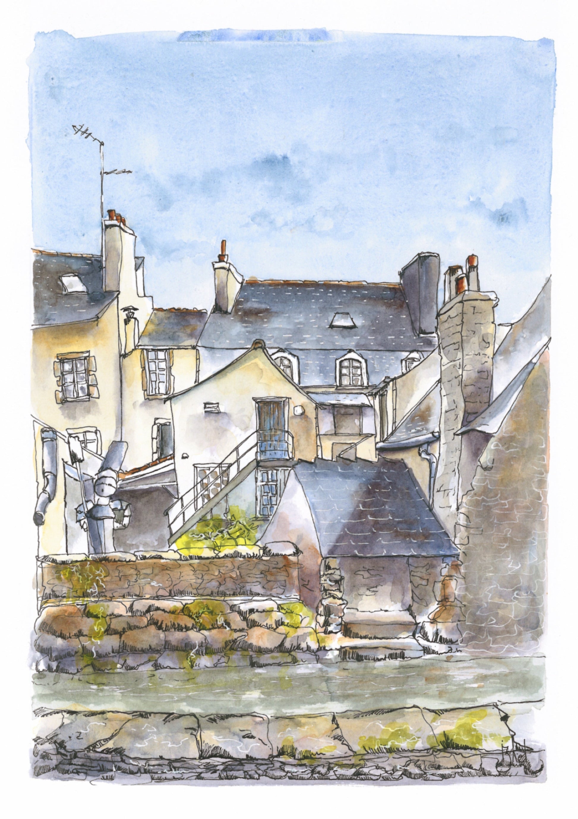 "Se rendre à Pont-Aven , emprunter la rue du Bois d'Amour et descendre vers la promenade Xavier Grall pour admirer les lavoirs, l'Aven qui cascade sur les chaos, enfin se laisser surprendre par ce drôle de pâtissier qui vous salue de l'autre côté de la rive !"